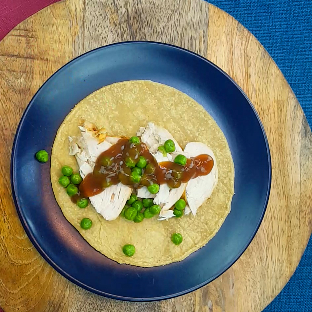 - On each tortilla, place some shredded chicken, peas & pour the gravy over the top.