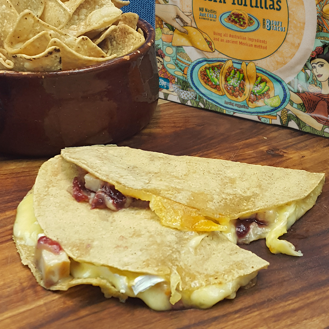 So it’s the day after Christmas, & you have a fridge full of left over turkey, ham, roast chicken, salads, cheeses & more. Sure you could have Christmas dinner all over again, or you could transform these left overs into something new & better: delicious tacos & quesadillas! Corn tortillas are the perfect vessel for using up your left overs, & they go perfectly with traditional Christmas dinner flavours. Turkey, Brie & Cranberry Sauce tacos anyone?